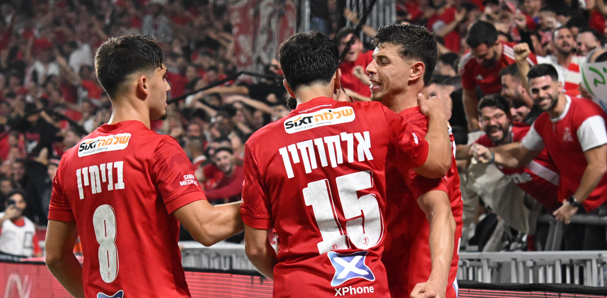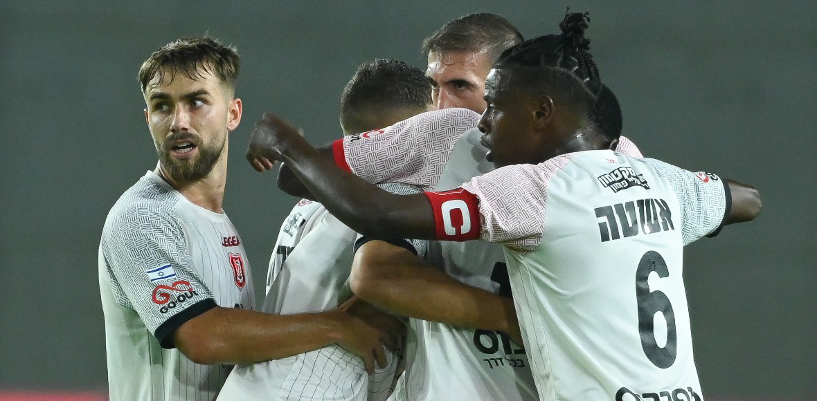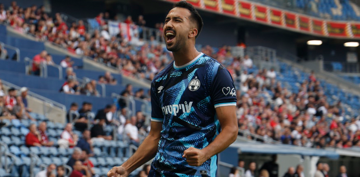 סתיו טוריאל חוגג עם חבריו שער נהדר (באדיבות: מחלקת המדיה של הפועל ת"א)