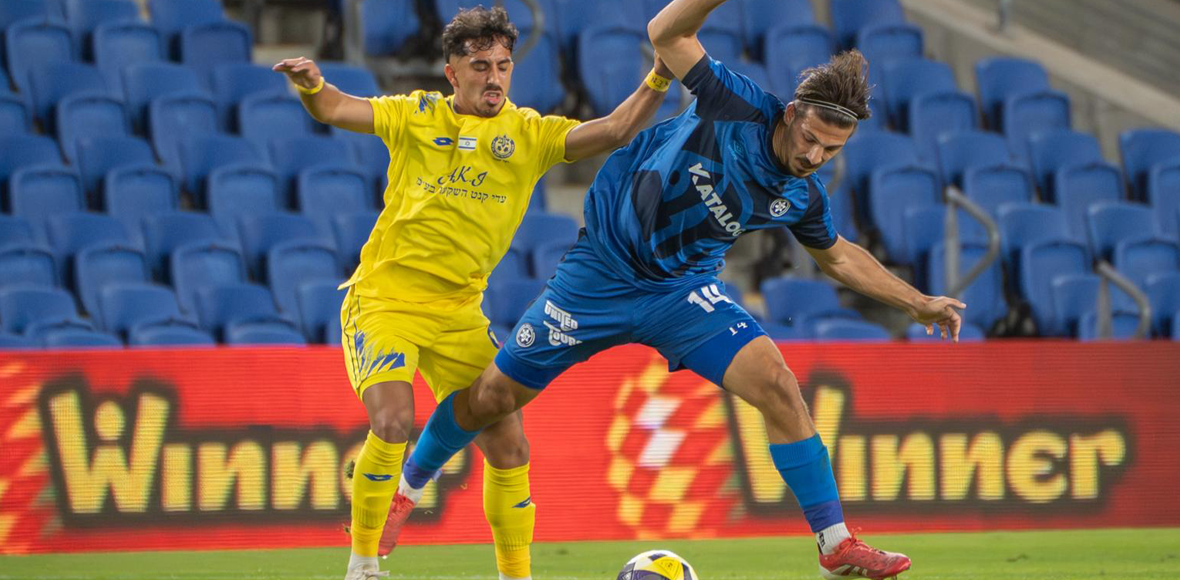 תמיר ארבל ומתאוס דאבו במאבק על הכדור, הערב בסמי עופר (באדיבות: מחלקת המדיה של מכבי נתניה)