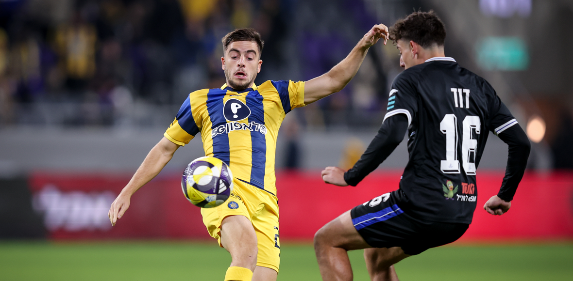 נועם בן הרוש מול רועי דוד במאבק על הכדור (צילום: מחלקת המדיה של מכבי ת"א)