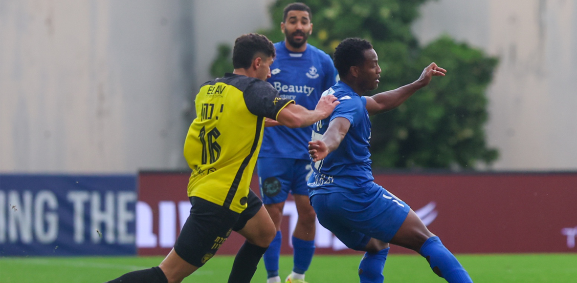 מתן לוי מנסה לחטוף למשה מאיר במפגש בין בני יהודה ת"א להפועל ר"ג (צילום: ליר שאולי)
