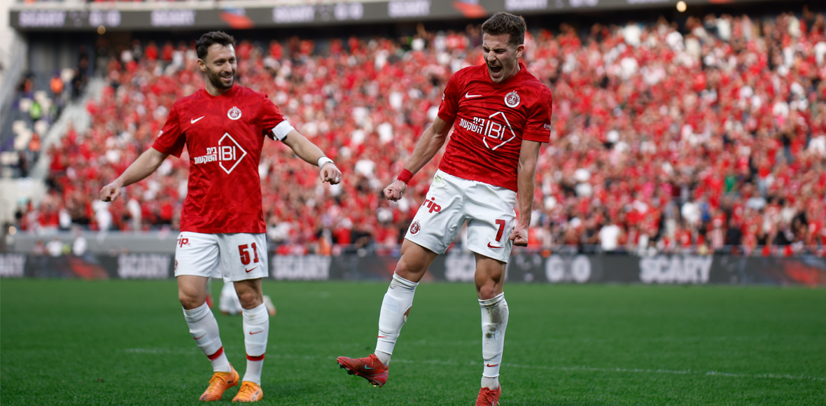 כובש השער הראשון, רוי קורין, חוגג עם עומרי אלטמן (צילום: מועדון הכדורגל הפועל תל-אביב)