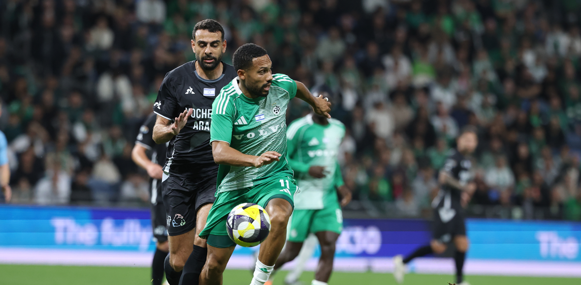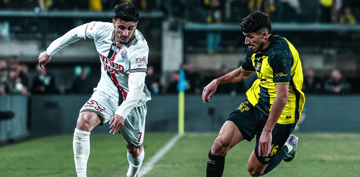 כובשי השערים, קנג'י חורה ו-והיב חביבאללה במאבק על הכדור (צילום: מועדון הכדורגל מכבי חיפה)